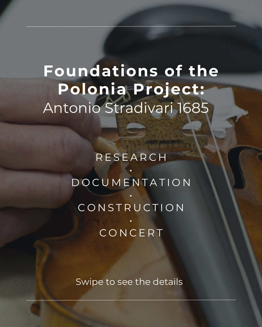 Celem przedsięwzięcia jest szczegółowe zbadanie i stworzenie pełnej dokumentacji arcydzieła sztuki lutniczej – jedynego w Polsce instrumentu Antonia Stradivariego o nazwie Polonia (1685). Od 2018 roku gra na nim Janusz Wawrowski, jeden z najwybitniejszych polskich wirtuozów. Dzięki uprzejmości muzyka skrzypce zostały udostępnione do badań.