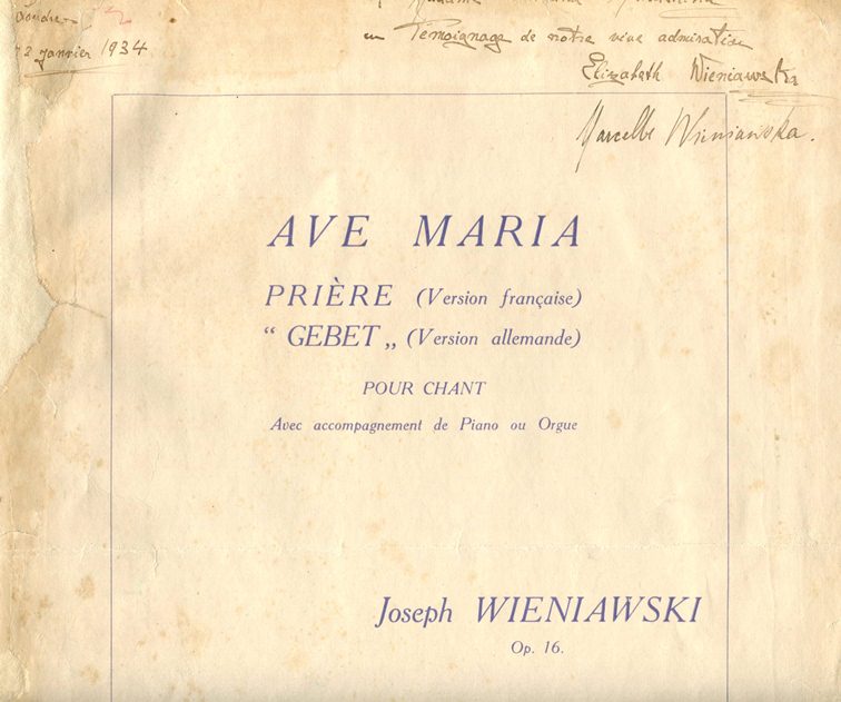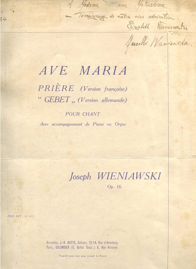 Proof that it did exist is in the Archives of the Henryk Wieniawski Musical Society where there is a fragment, only the title page, of a work entitled Ave Maria Priere (Version francaise) Gebet (Version allemande) pour chant avec accompagnement de piano ou orgue. Joseph Wieniawski Op.16. The song was published in Brussels by J. B. Katto and in Paris by Colombier. Although there is no date of publication it bears a handwritten dedication from Jozef's two daughters, Elizabeth and Marcelle, to the Russian soprano Tatiana Makushina "en temoignage de notre vive admiration." which is dated "Londres 22 janvier 1934." Born in Brussels the daughters had come to live permanently in London after their father's death. Elizabeth, who was a teacher of languages, died in 1978. Her sister Marcelle died in 1990. Tatiana Makushina sang at several Promenade Concerts at the Royal Albert Hall in London during the 1920s and 30s and it is possible Elizabeth and Marcelle heard her at one of these concerts and were impressed enough to give her a copy of their father's song.